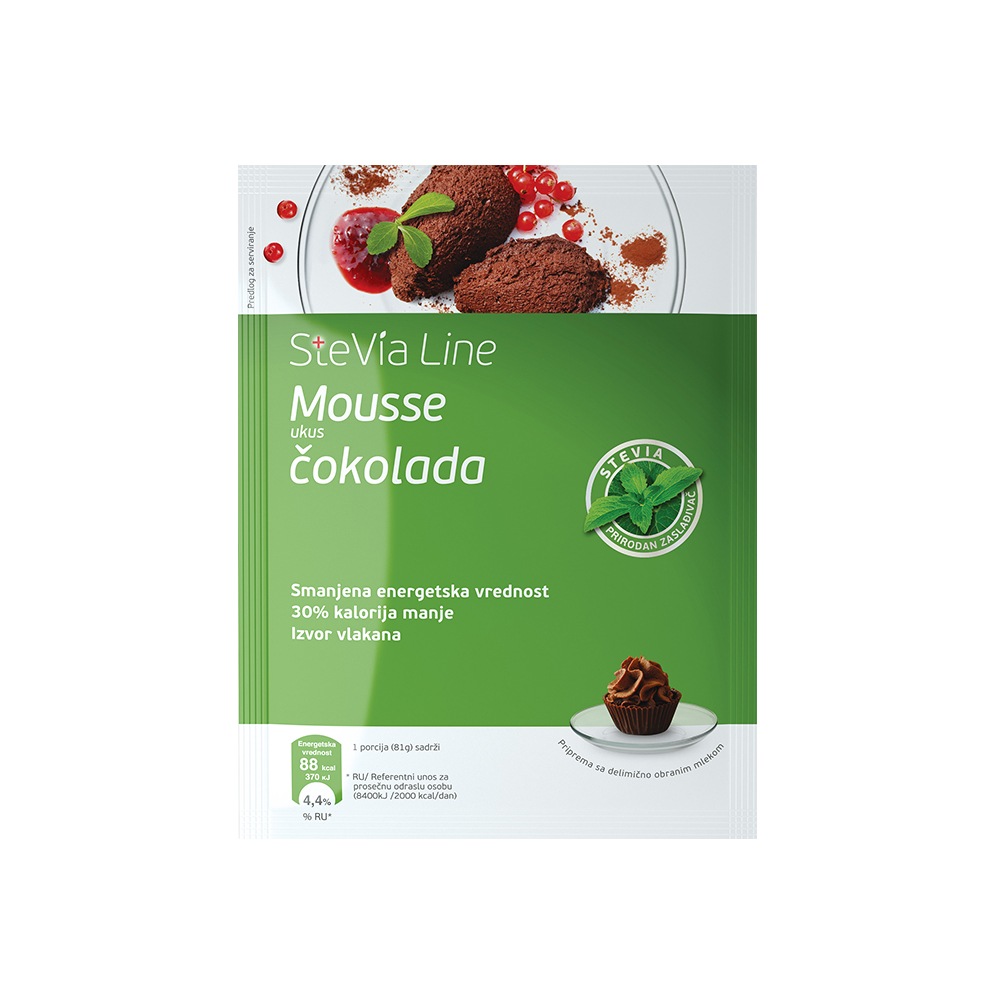 Kada nemate vremena za pripremu musa, a pritom želite laganu poslasticu bez šećera, pravi izbor je Stevia Line mus. Fina i čvrsta kremasta struktura sa ukusom čokolade predstavlja pravi užitak, naročito ako se služi rashlađen i u kombinaciji sa osvežavajućim voćem. Brzo se priprema, za 2-3 minuta.