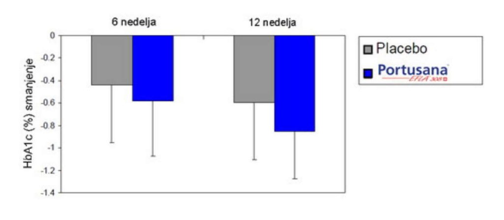 Rezultati: Na početku istraživanja pacijenti su podeljeni u dve grupe na osnovu demografskih podataka i zdravstvenog stanja. Nakon 6 nedelja nivo HbA1C se poboljšao u gotovo 80% pacijenata, a nakon 12 nedelja lečenja Frutarovim biljnim ekstraktom Portusane, je značajnosmanjena koncentracija HbA1C u odnosu na placebo grupu. Na kraju studije je došlo do smanjenja HbA1C za 0.85 jedinica što je nadmašilo placebo za 44%. Nisu zabležene ozbiljne nuspojave, a sam ekstrakt se dobro podnosi tokom posmatranog perioda.
